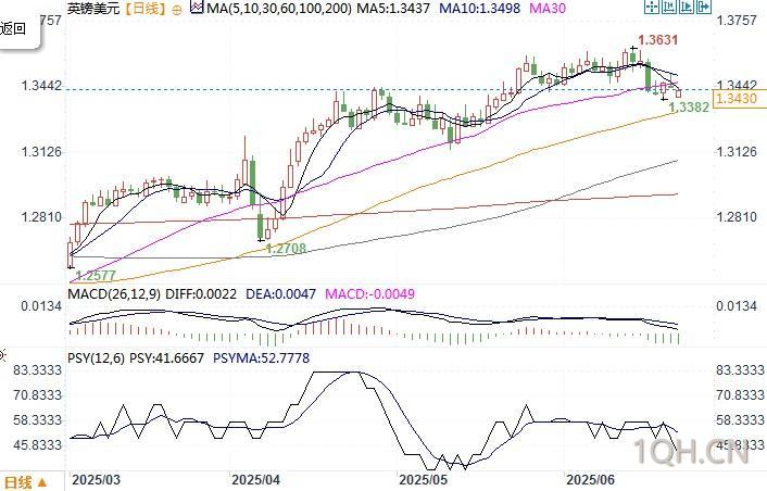 北京时间6月23日10:47 英镑兑美元 报 1.3430/32。,