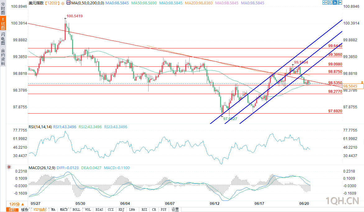 近期跌破上升通道且在99.10附近遇阻,凸显动能减弱。若收盘价持续低于98.53,下行动能将指向98.28和98.03。