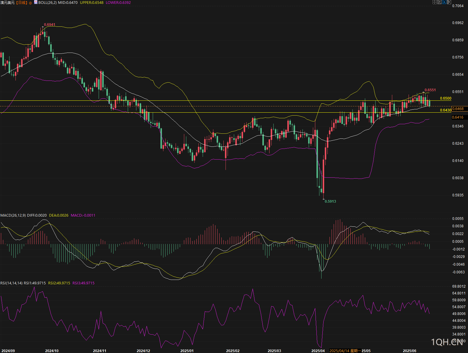 从日线图技术分析来看,澳元/美元汇价目前运行在布林带中轨附近,布林上轨位于0.655,布林下轨位于0.639水平。汇价在过去三周内维持在0.6445-0.6550区间内振荡,6月3日和13日的两次探底均在0.6445-0.6455区域获得支撑。