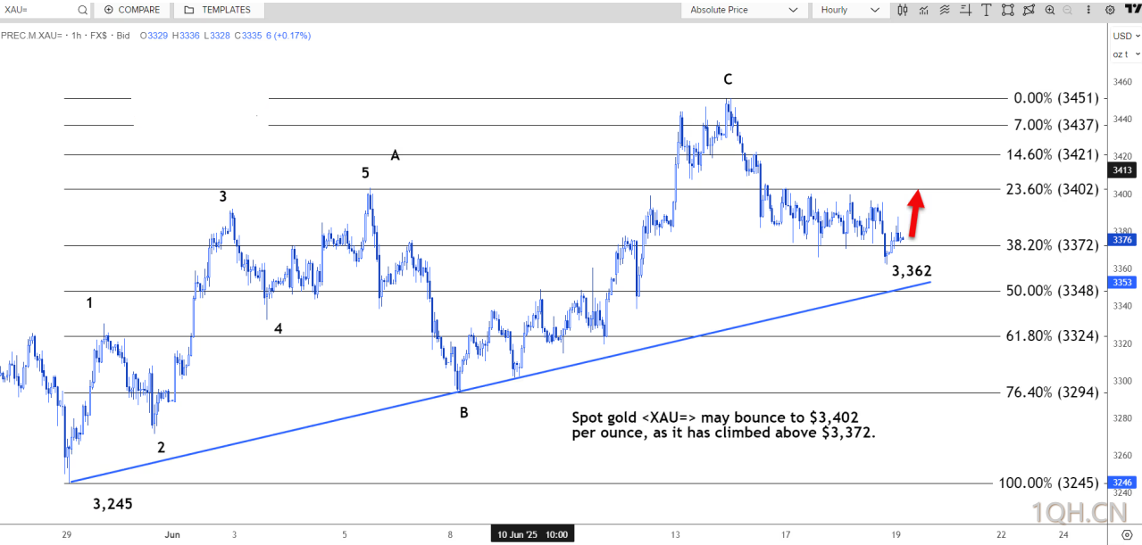 路透技术分析师指出,现货黄金可能反弹至每盎司 3402 美元,目前已攀升至 3372 美元以上。