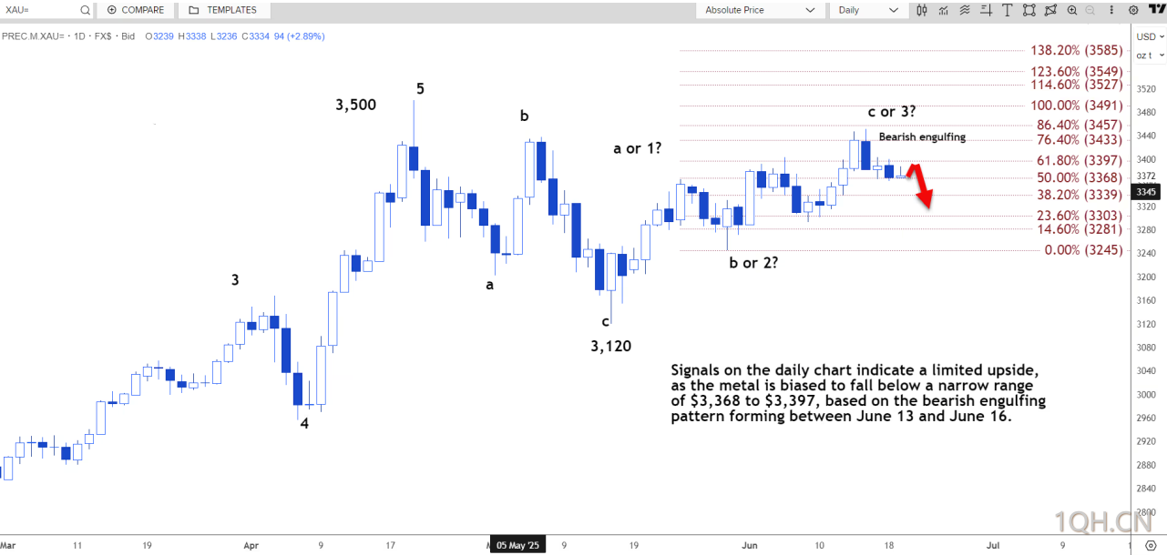 日线图上的信号表明,金价上涨空间有限,因为根据 6 月 13 日至 6 月 16 日形成的看跌吞没形态,金价有可能跌破 3368 美元至 3397 美元的窄幅区间。