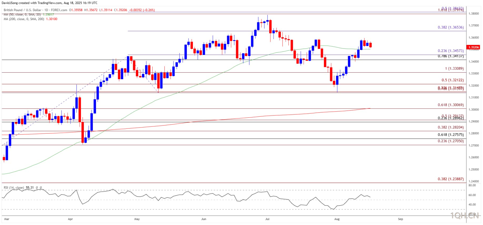 英镑兑美元若能持稳于50日均线(1.3501)上方,则有望延续上周涨势。若突破/收于1.3650(38.2%斐波那契扩展位)上方,或将测试7月高点(1.3789)。