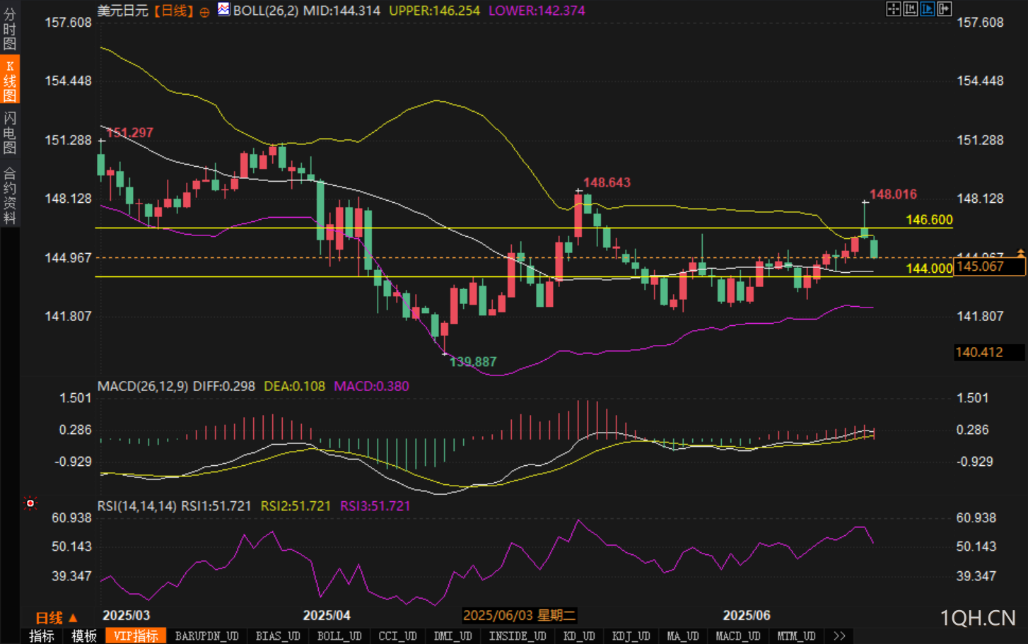 从布林带结构来看,中轨位于144.314,汇价正围绕该中轨区间震荡。布林带上轨(146.254)与前高148.643构成阻力带,而下轨142.374为后市重要支撑区。当前价格运行在中轨与上轨之间,仍属宽幅整理结构。