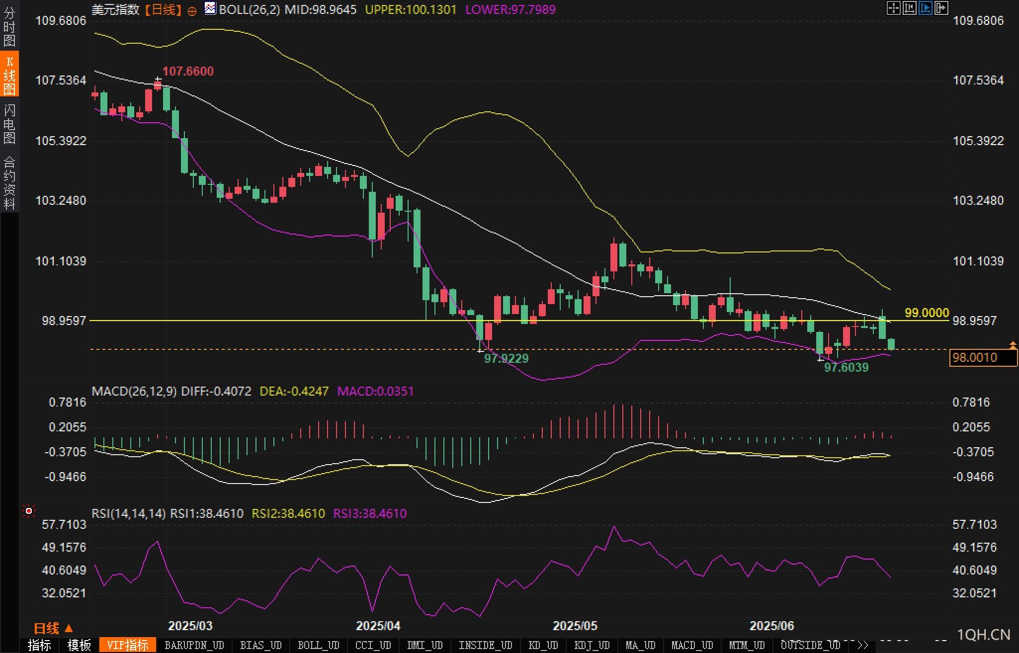 支撑位方面分析认为,当前关键关注97.60–97.80区域,该区间若失守,97将成为下一个测试点;阻力位位于99.00及100.13(布林上轨)一线。