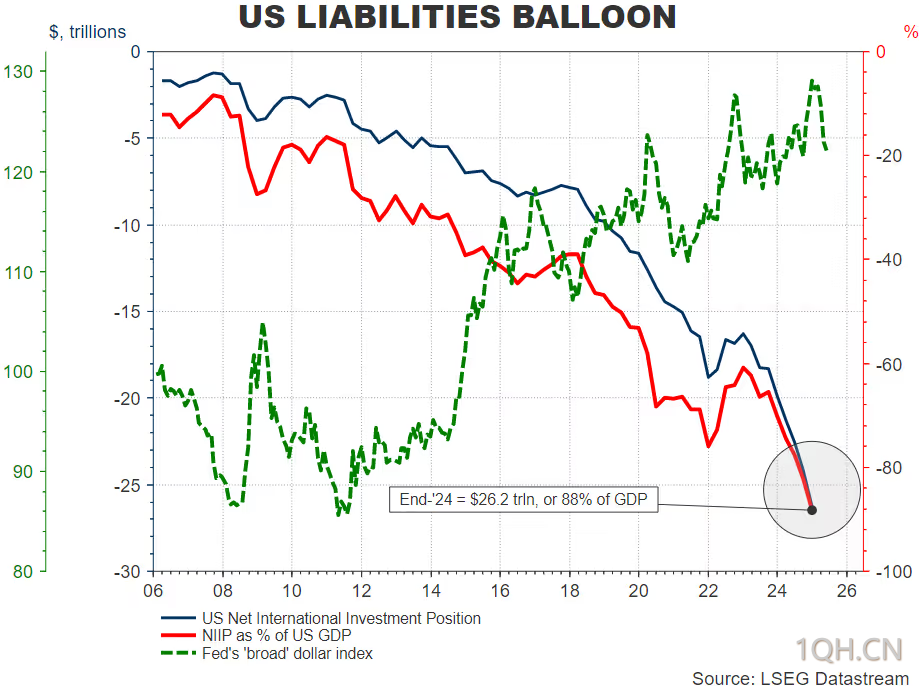 图:美国负债气球,蓝线为美国净国际投资头寸(NIIP),红线为NIIP占美国GDP的百分比,绿线为美联储的"广义" 美元指数。