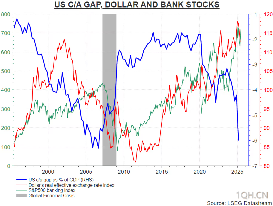 图:美国经常账赤字/GDP比率、美元走势与标普500银行类股表现