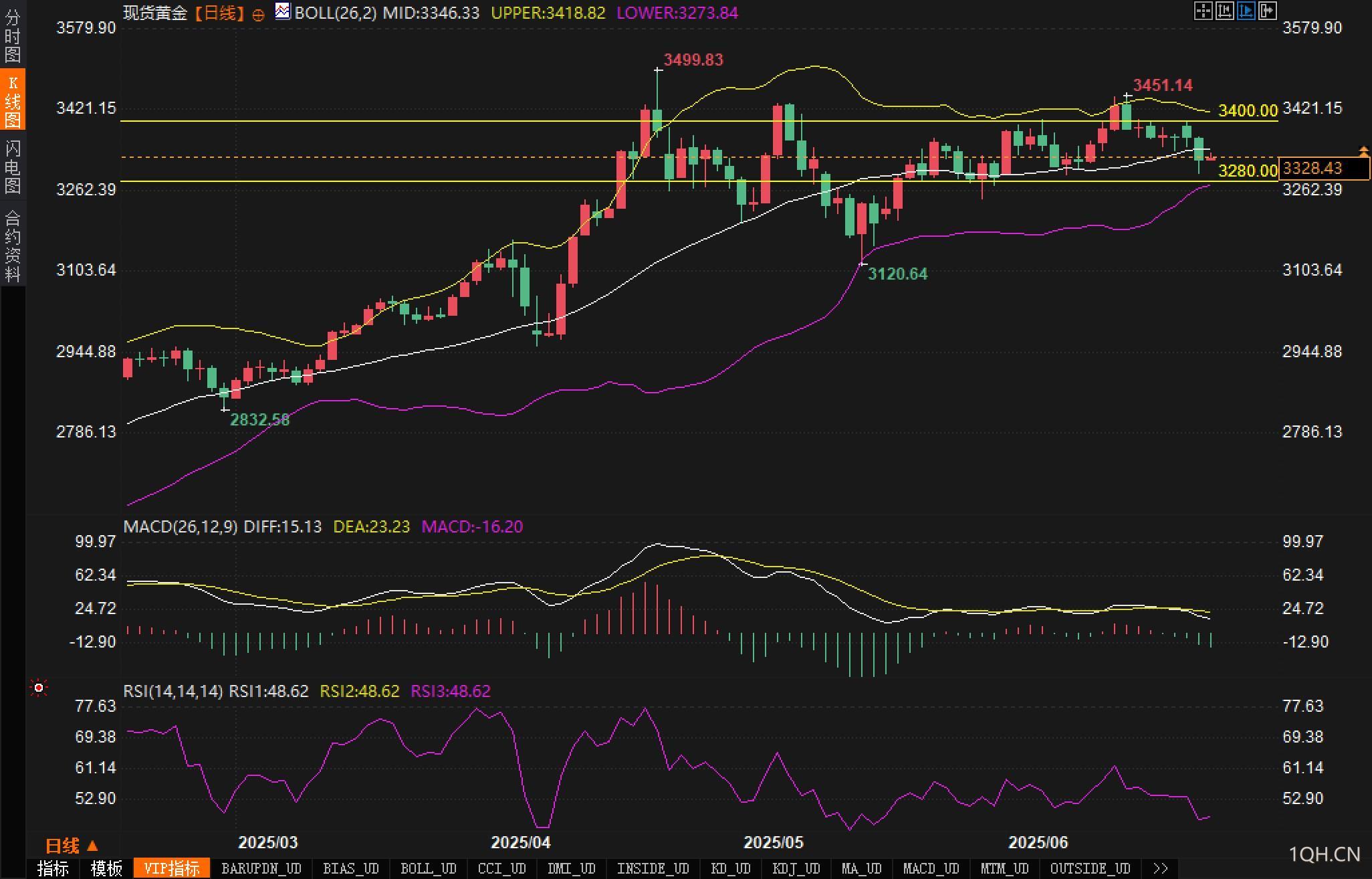 从日线图来看,现货黄金在创出3451.14美元高点后震荡回落,当前运行于布林带中轨(3346.33)与下轨(3273.84)之间,布林带整体呈现收敛状态,表明行情处于震荡整理阶段。分析认为若跌破3280美元一线的支撑位,则有可能测试布林下轨。