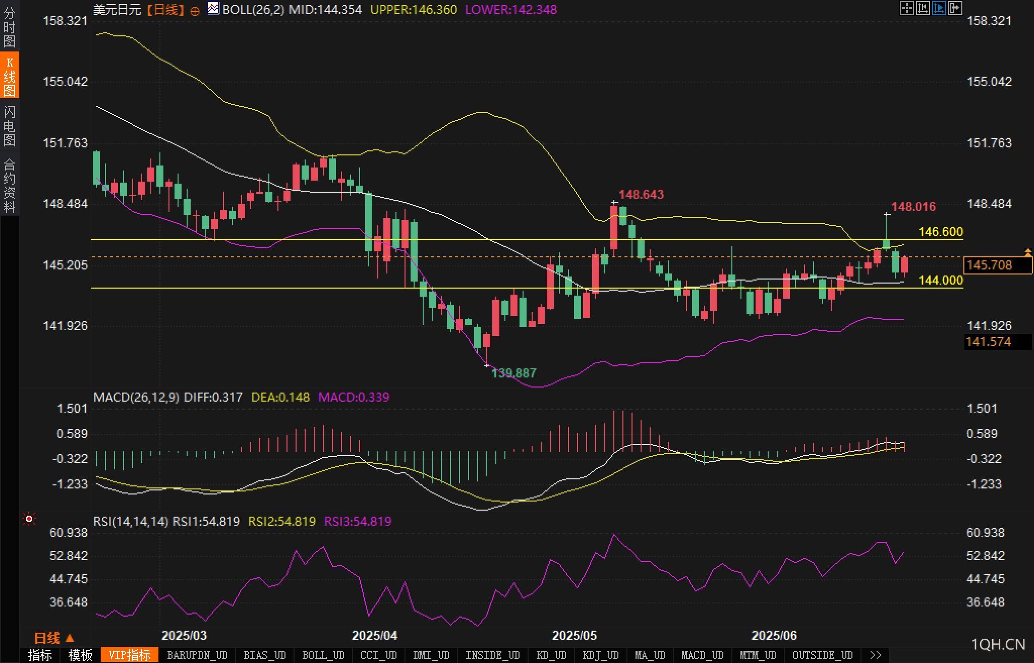 短线来看,分析认为若美元兑日元能够站稳146上方并持续放量上攻,则有望冲击148.643前高,进一步打开150关口空间。但若冲高回落、失守支撑位144,行情将重新转入震荡区间或技术性回调。