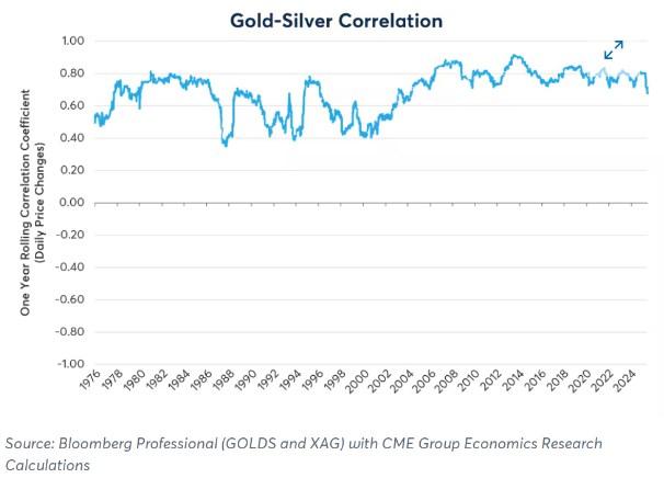Norland指出,在日线图上,金银价格通常高度相关,一年滚动相关系数处于0.68至0.95之间。