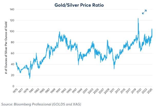 在CME周二发布的一份分析报告中,Norland指出,金价升至每盎司3500美元上方的历史新高,然后有所回落。他说:“银价也一直在同步上涨,在每盎司37美元上方见顶,但仍远低于1980年和2011年的双高点。随着时间的推移,黄金和白银的相对价格(以它们的价格比率来衡量)伴随着供应增长、央行购买、技术进步以及亚洲大国经济增速已经发生了变化。”