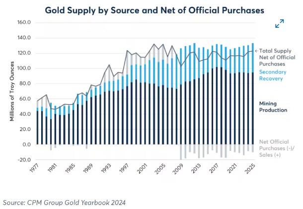他表示,从供应的角度来看,黄金相对于白银表现出色可能显得很神秘。他说:“近年来,黄金开采供应量约为9700万盎司,而白银开采产量约为8亿盎司。黄金和白银的开采产量在2010年代中期达到顶峰,在2010年代后期下降,然后稳定下来。二级供应(回收金属)一直在增加,但二级供应往往回应价格变化,而不是推动价格变化。”