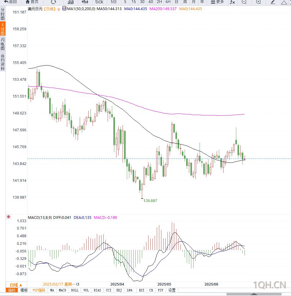 4小时图显示,美元兑日元上行至144.80附近遇阻,未能突破200日均线。技术指标如MACD和RSI转入空头区域,表明价格可能再次回落测试144.00及143.75支撑。若跌破143.75,将打开下行通道,目标指向142.90-143.00区间。
