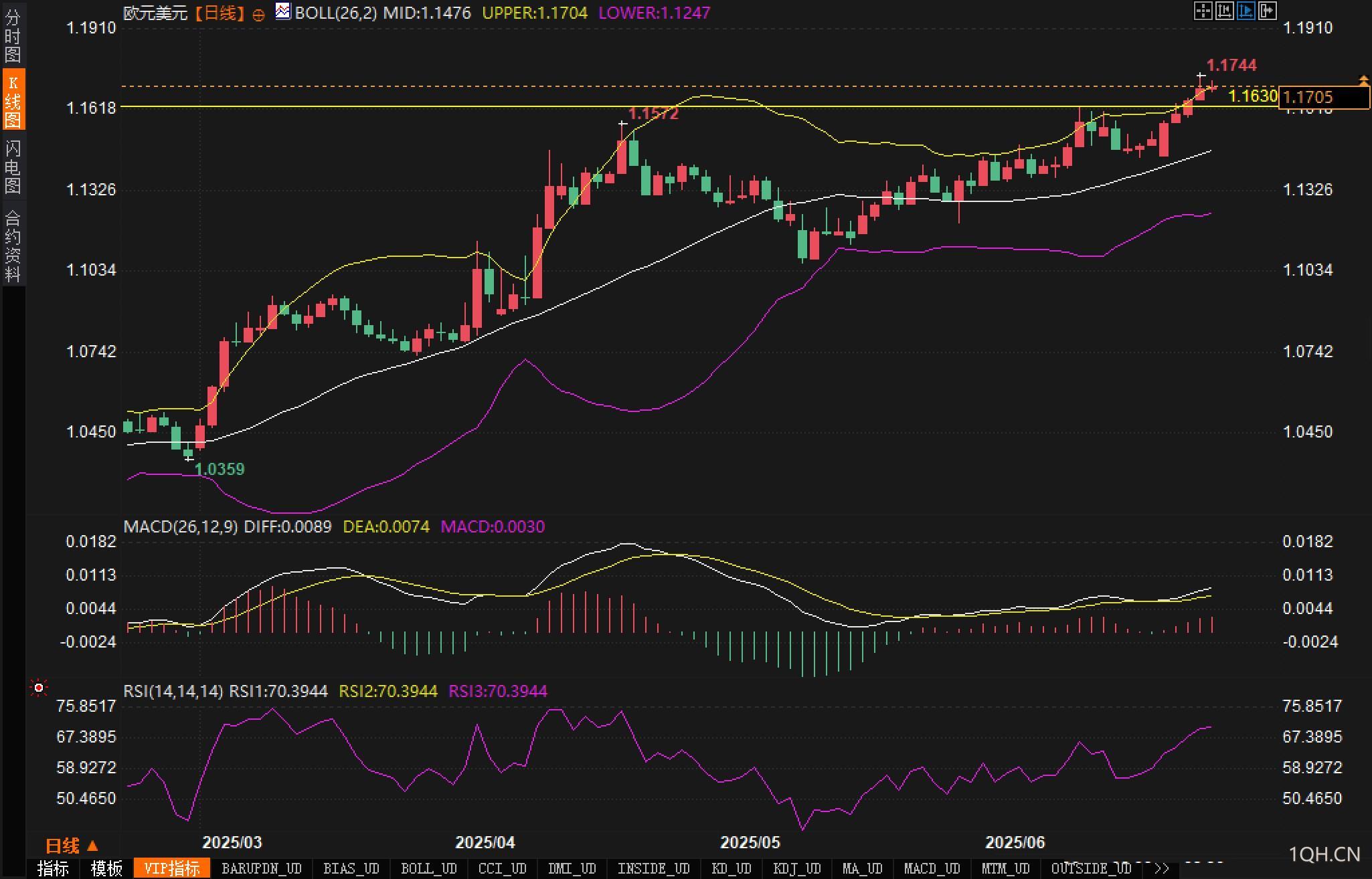 当前日线图显示欧元/美元保持强势上升趋势,已突破布林带上轨1.1704一线,表明短期内动能强劲,进入超买区间。K线连续收出阳线,显示买盘意愿浓厚。