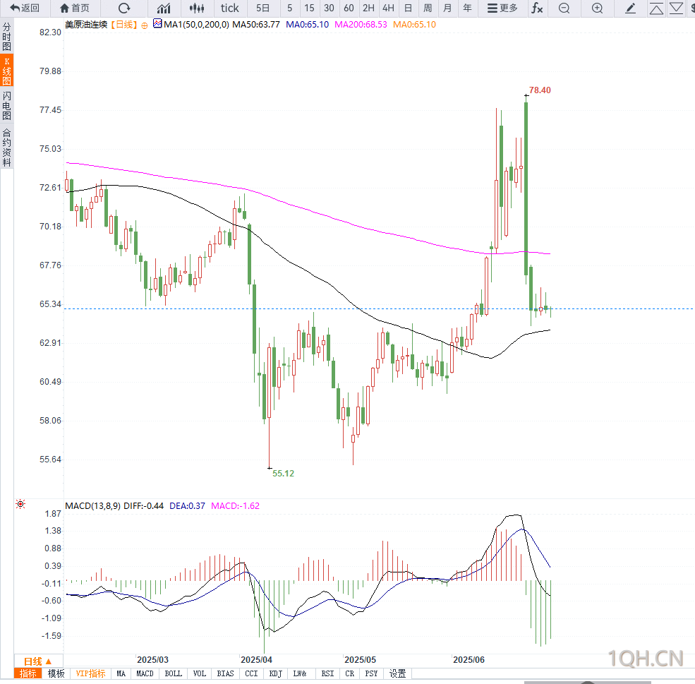 若价格持续低于65美元,下一支撑位将下看5月低点62.80美元;而若能重新站稳65.80美元上方,则可能展开技术性反弹,向上测试200日均线附近的67.30美元阻力位。整体来看,油价正处于下行通道内,短期趋势偏弱,需警惕进一步回调风险。