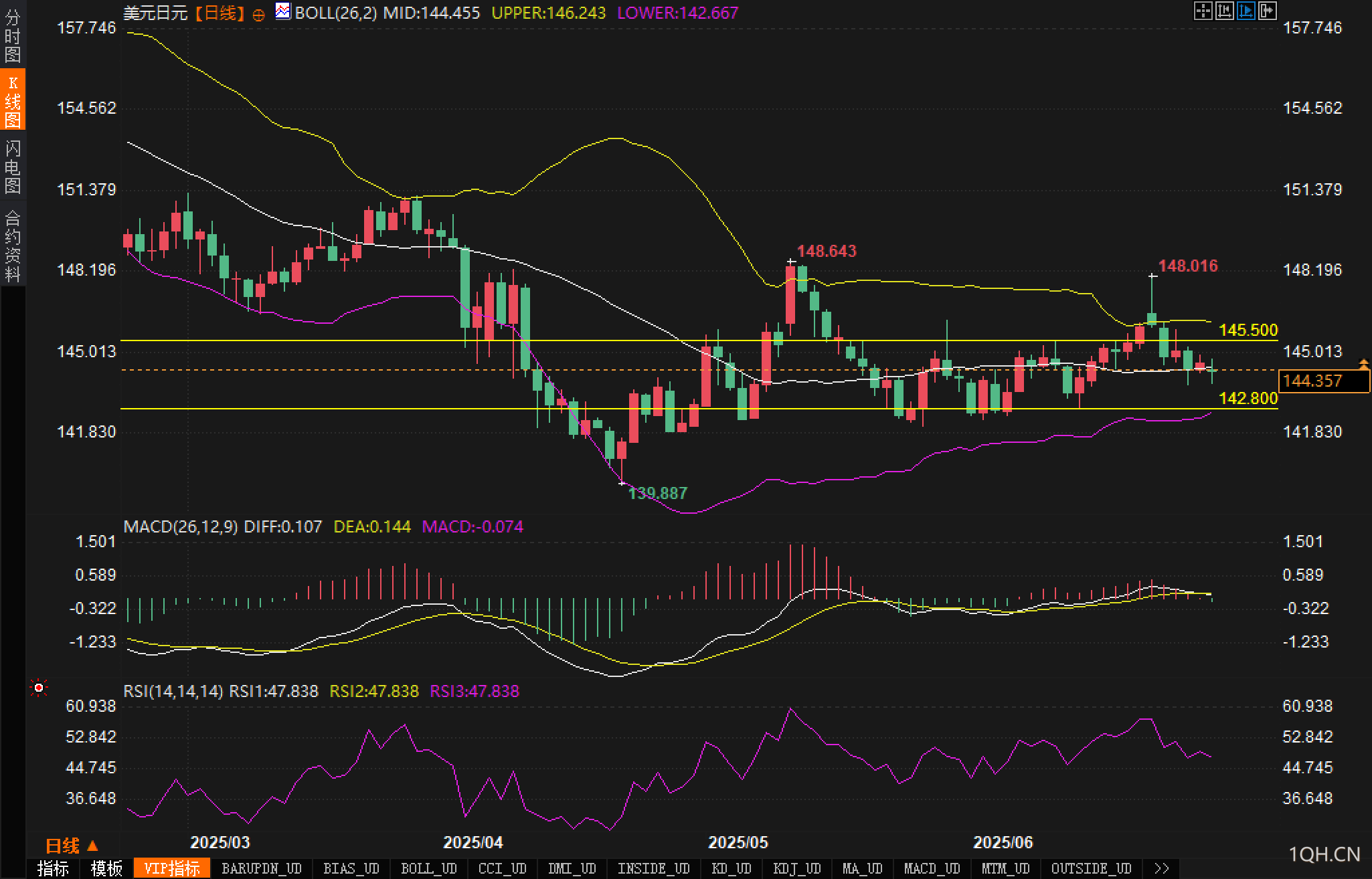K线结构显示,近期形成较为明确的震荡区间,上方阻力位集中在145.500,下方支撑位于142.800。当前价格运行在布林中轨下方,短期趋势偏空。