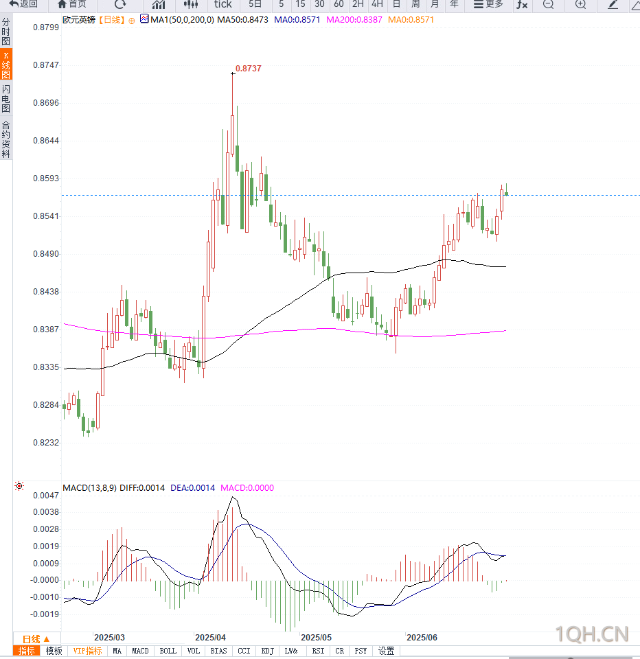 当前EUR/GBP在0.8575附近震荡,若跌破0.8565-0.8570支撑区域,可能进一步下探至6月低点0.8535附近。反之,若德国疲软数据未扩展至欧元区整体,且BoE偏鸽预期增强,则汇价或有望反弹测试0.8600-0.8620阻力带。