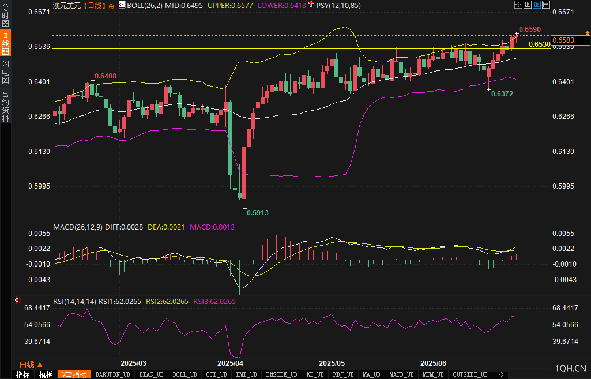 从日线图来看,汇价在有效突破0.6530关键阻力位后加速上行,当前运行至布林带上轨附近,日内最高触及0.6590,标志着年内新高的确立;显示多头动能占优,短期趋势明确偏多。
