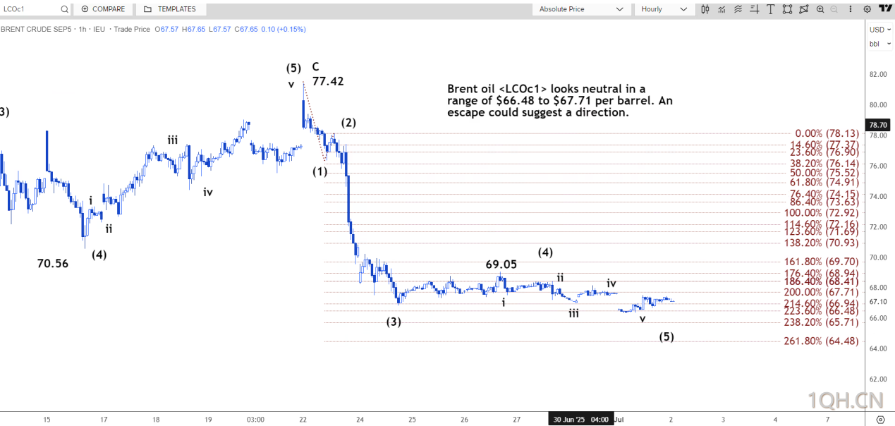 路透技术分析师指出,布伦特原油在每桶66.48美元至67.71美元区间内呈现中性走势。突破这一区间可能预示着未来走势。