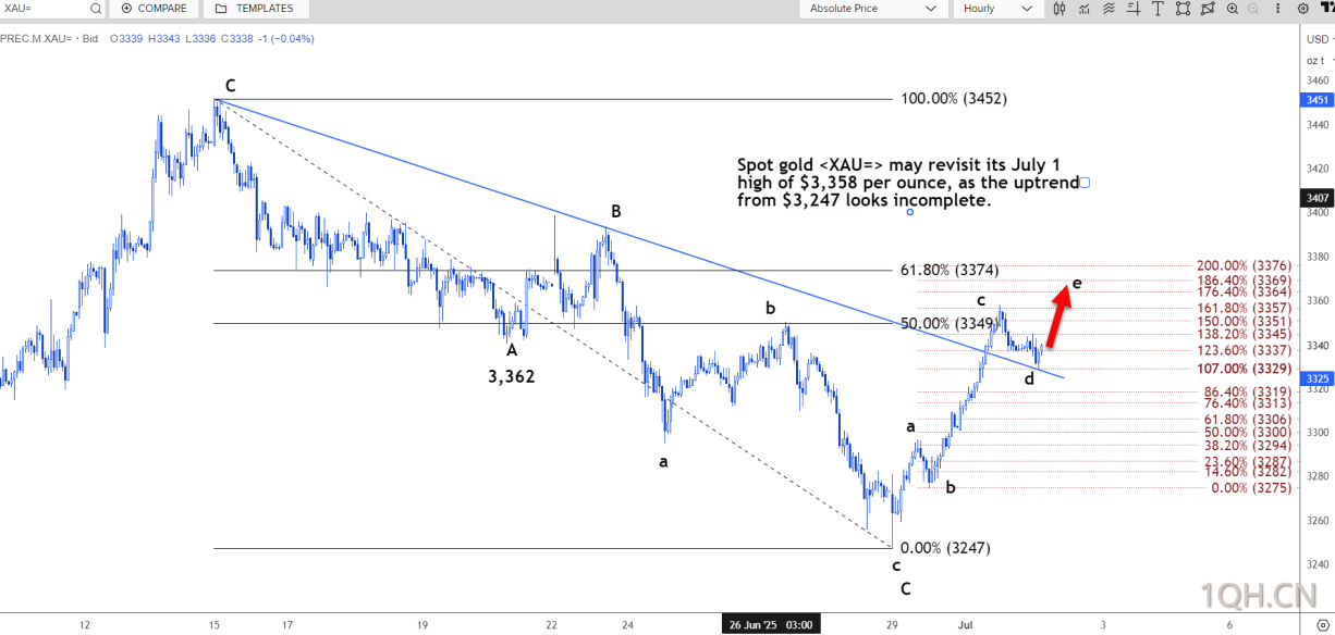 路透技术分析师指出,现货黄金可能重新回到 7 月 1 日每盎司 3358 美元的高点,因为从 3247 美元开始的上涨趋势似乎尚未完成。