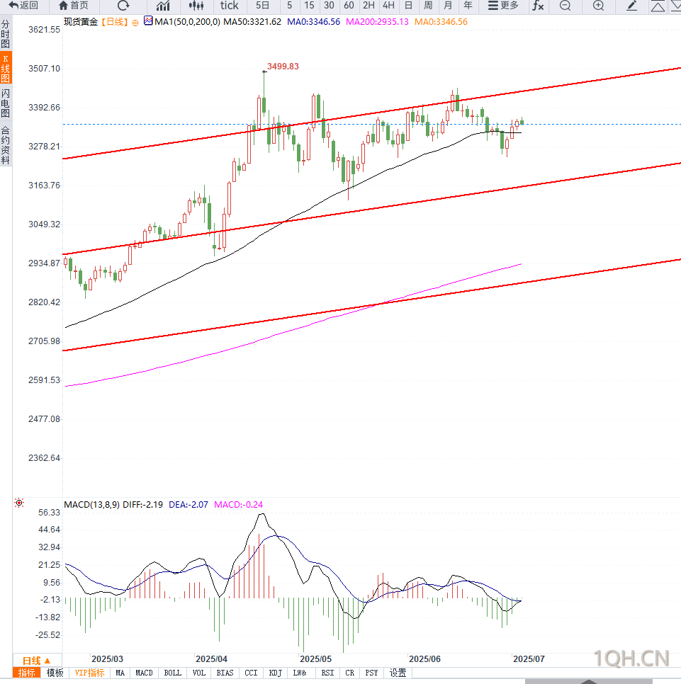 RSI指标处于60至65区间,尚未进入超买区,但显示出稳健的多头动能。MACD快慢线延续上行趋势,红柱动能增强,暗示上涨势头尚未结束。若金价能够有效突破3370美元阻力位,有望进一步测试前高3450美元;下方关键支撑位则位于3315美元和3275美元区间。