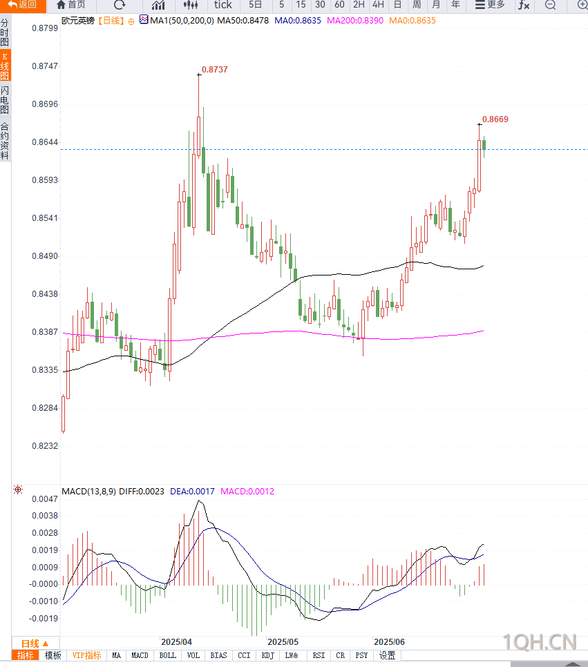 欧元兑英镑当前受制于双边政治经济风险的不对称交错。欧元受益于欧央行鹰鸽平衡策略,但面临美欧贸易谈判不确定性;英镑则在经济韧性与财政疑虑之间拉扯,国债市场动荡可能加剧政策压力。