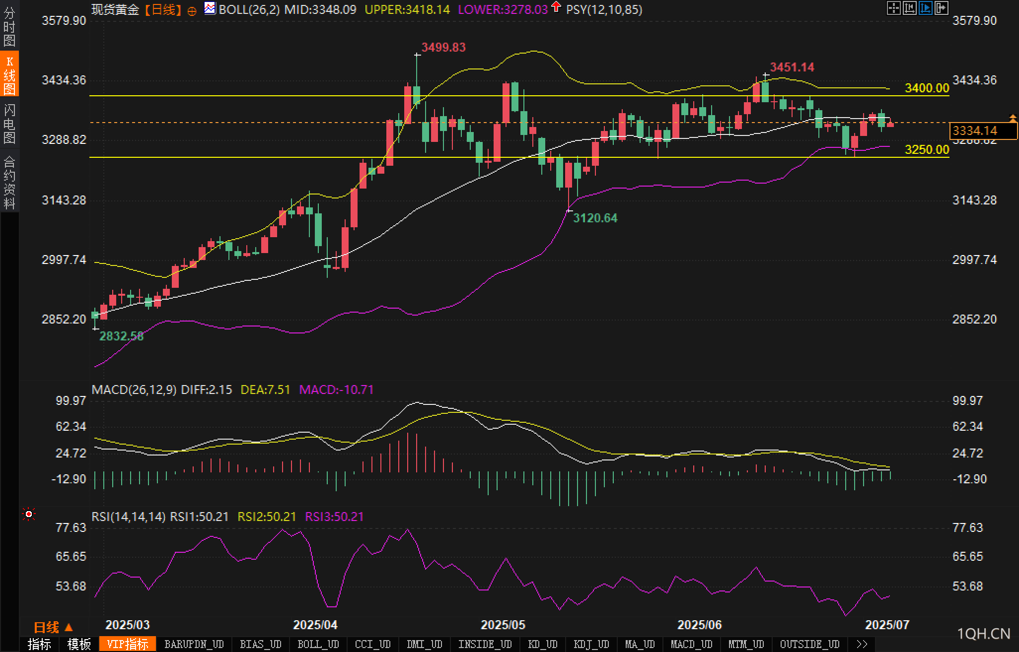 当前黄金日线图运行于布林带中轨(3348.09)下方,短期呈现盘整格局。分析认为上方阻力位集中于3400美元与3451美元前高区间,形成明显的矩形整理区间;下方关键支撑位为3250美元,若有效跌破或触发新一轮下探。