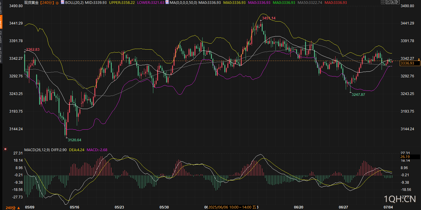 本周现货黄金价格呈现先扬后抑的走势。周一至周三,金价受避险需求和美元疲软推动,录得三连涨,从3271美元/盎司快速攀升至周三午后的周内高点3365美元/盎司,显示出强劲的上行动能。然而,周四在6月非农就业数据发布前,市场情绪转向,金价急挫至3312美元/盎司,创下周内最大单日跌幅。周五受美国独立日假期交投清淡影响,金价在3330至3355美元/盎司区间内震荡,收于3337美元/盎司附近,单周上涨约1.91%。