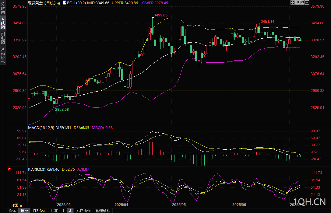 从技术面来看,黄金价格目前处于高位盘整状态。Barchart高级市场分析师Darin Newsom指出,8月黄金期货价格在3340美元附近,接近4月高点3539.30美元与5月低点3151美元的中点区域。短期内,金价在3250美元至3476.30美元之间波动,显示出横盘整理的特征。
