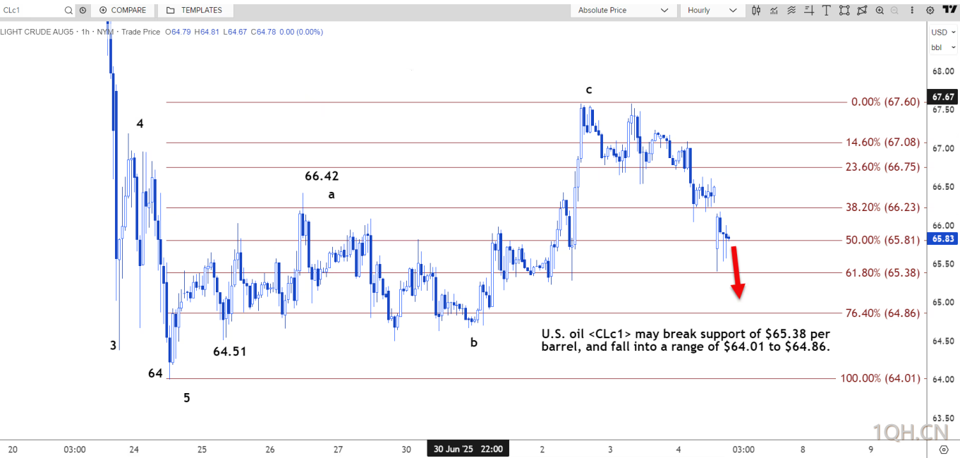 路透技术分析师指出,美国原油可能跌破每桶 65.38 美元的支撑位,跌至 64.01 美元至 64.86 美元的区间。