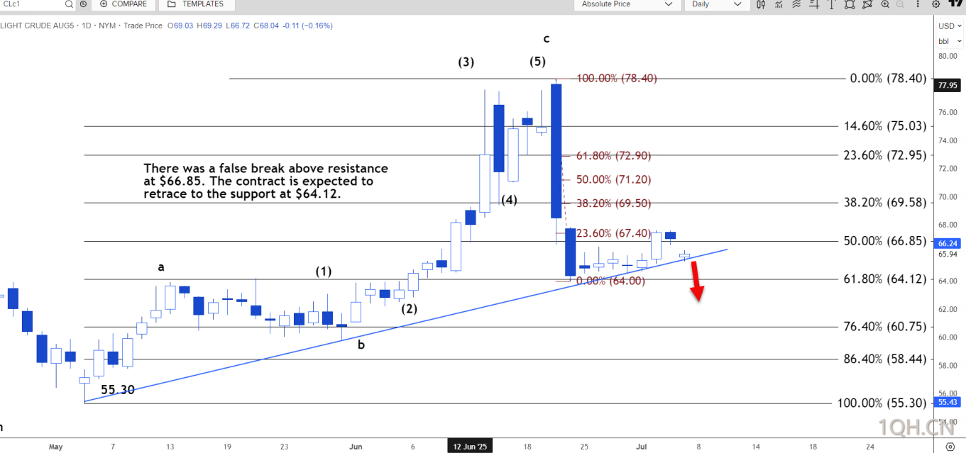 该支撑位被确定为64.01美元至67.60美元上涨趋势线的61.8%回撤位。一旦突破该阻力位,市场很可能重新回到6月24日的低点64美元。