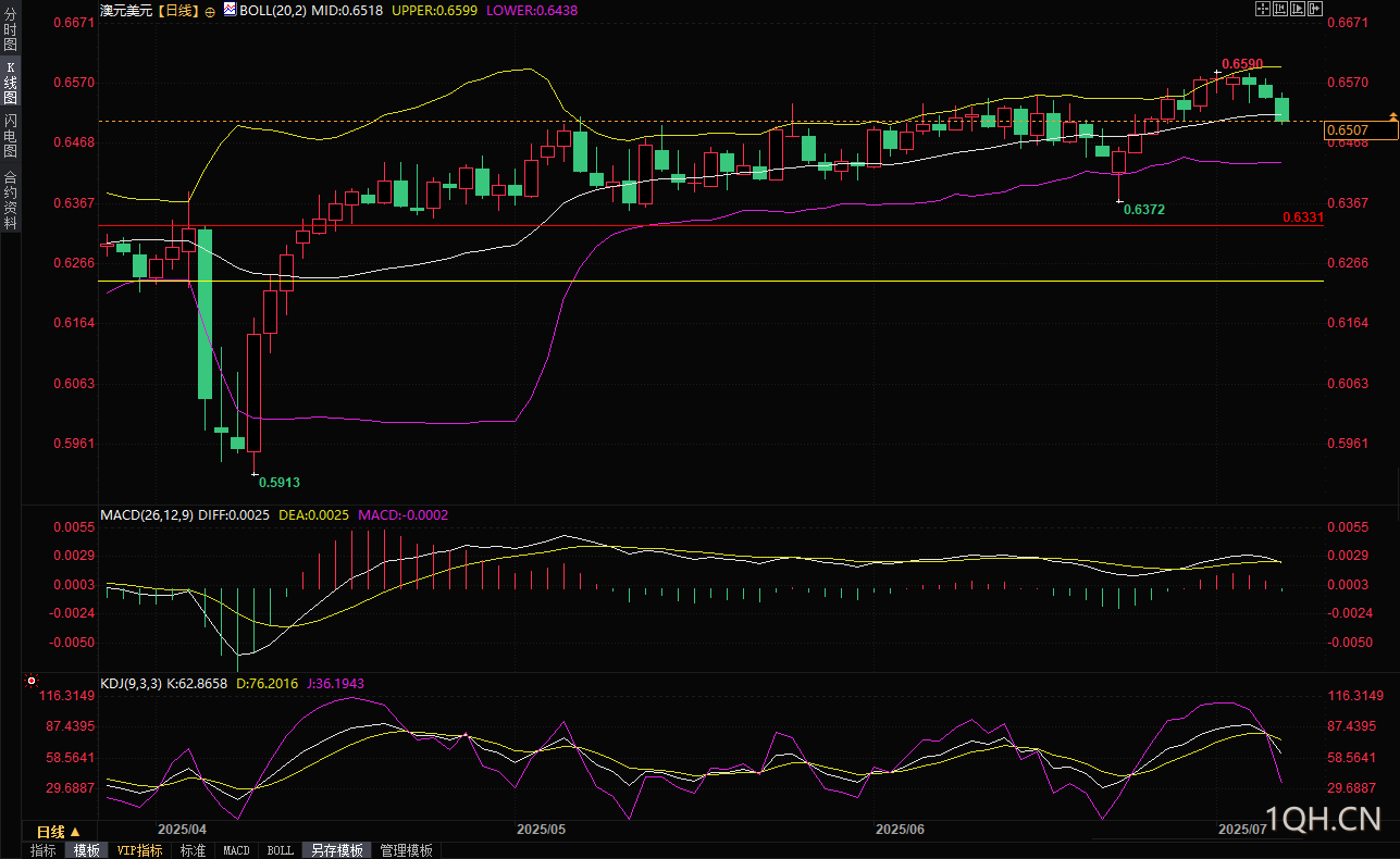 周一(7月7日)亚洲时段,澳元兑美元一度下跌0.73%至0.6500,创下6月25日以来的最低水平。上周,澳元仅小幅上涨0.3%,在0.6590美元的八个月高位遭遇了强大的阻力。这一阻力位的存在,表明市场对澳元的看涨动能有所保留。