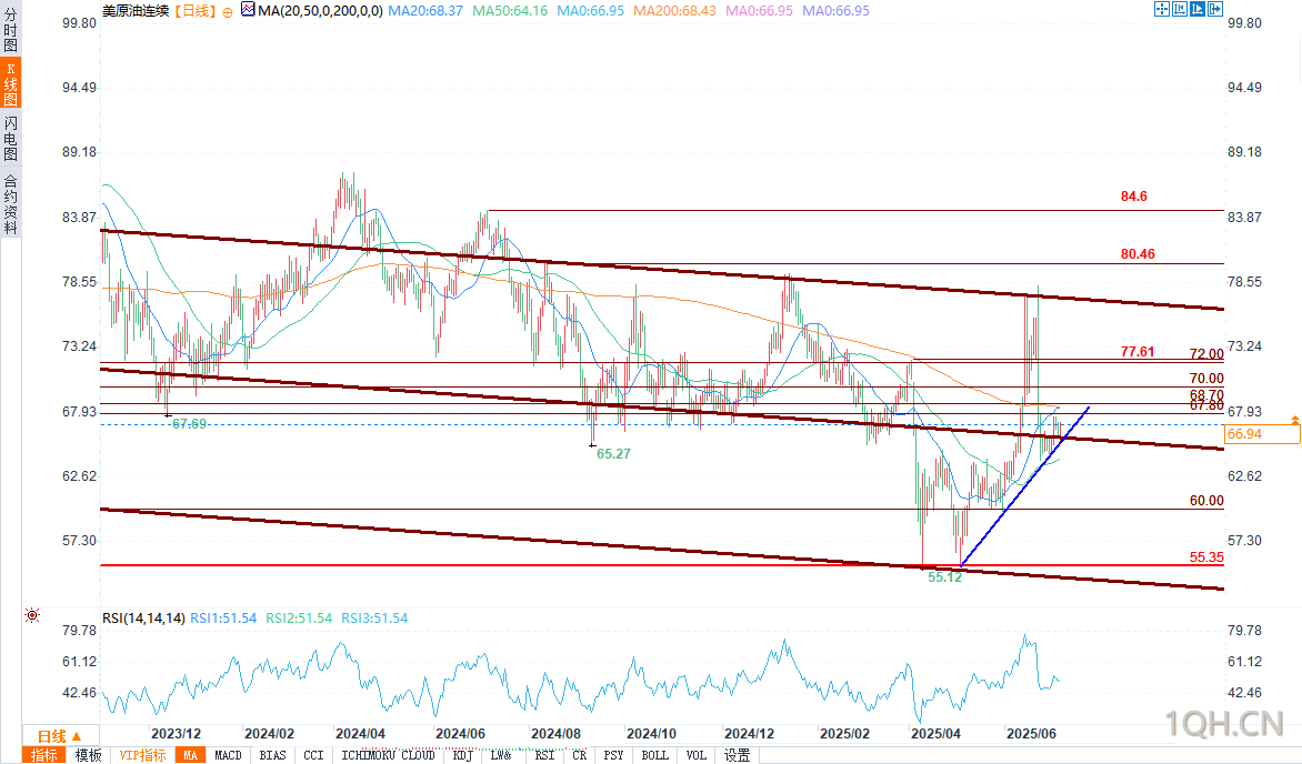 近期油价经历了一波波动:从57.00的低点反弹至78的高点,随后又跌至64.00,目前价格走势较为平稳。油价正处于长期下行通道中,但仍位于可追溯至5月初的短期上升趋势线上方,涨幅受20日移动平均线压制。