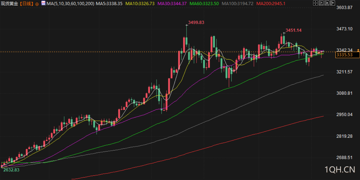 受美元走强影响,现货金稍早下跌超过1%,现货金报每盎司3332.62美元,下跌0.1%。美国期金变化不大,报收于 3342.8 美元。