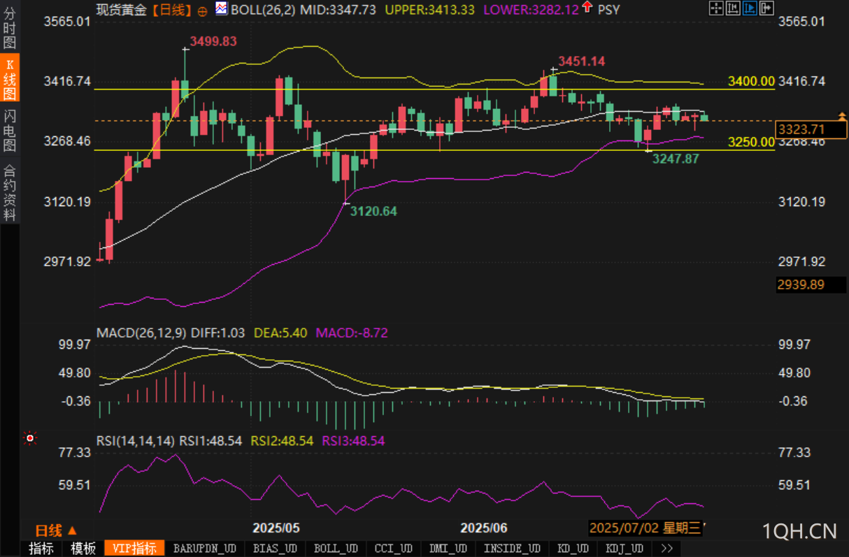 短线而言,分析认为在缺乏明确突破信号前,黄金将维持3250-3400的箱体运行,方向选择需等待布林带突破或宏观事件驱动。