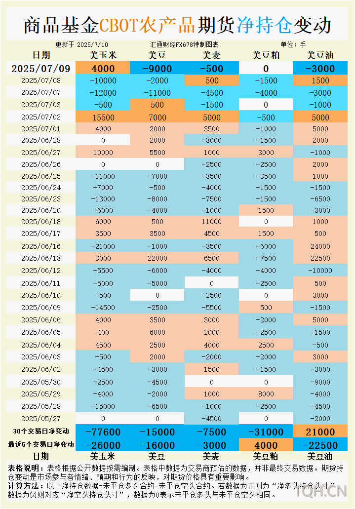 CBOT小麦期货过去30个交易日净空头持仓增加7500手,最近5个交易日新增3000手净空头,7月9日继续增加投机性净空头。基金抛售情绪受到北半球丰收压力驱动,市场对小麦供过于求的预期增强。