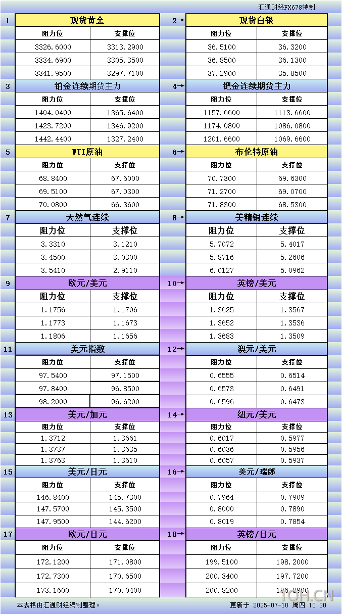 7月10日亚市更新支撑阻力:18品种支撑阻力(金银铂钯原油天然气铜及十大货币对)