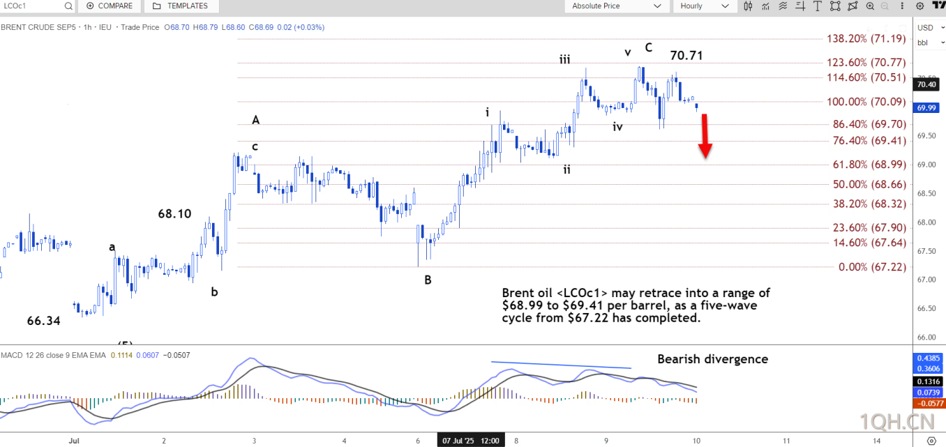 路透技术分析师指出,布伦特原油预计跌向 68.99 美元至 69.41 美元的区间,因为其已跌破每桶 69.70 美元的支撑位。
