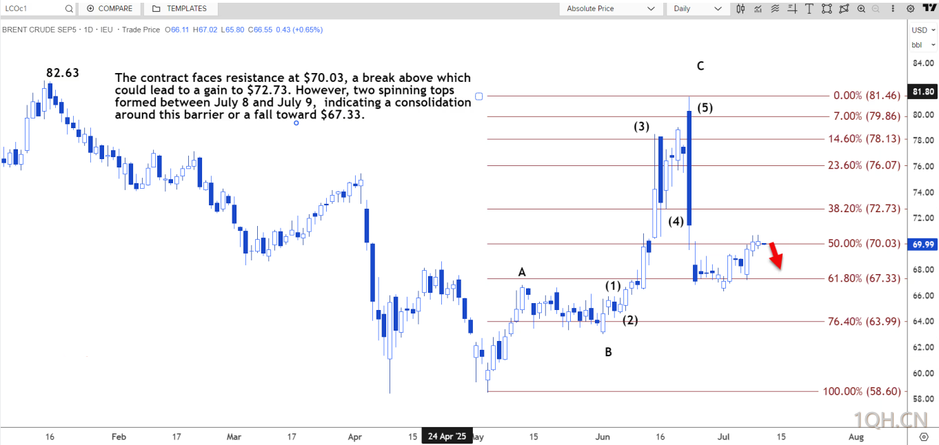 日线图显示,该合约在70.03美元面临阻力,突破该阻力位可能上涨至72.73美元。然而,7月8日至7月9日期间出现了两次陀螺形态,预示着该阻力位将围绕该阻力位盘整,或跌向67.33美元。