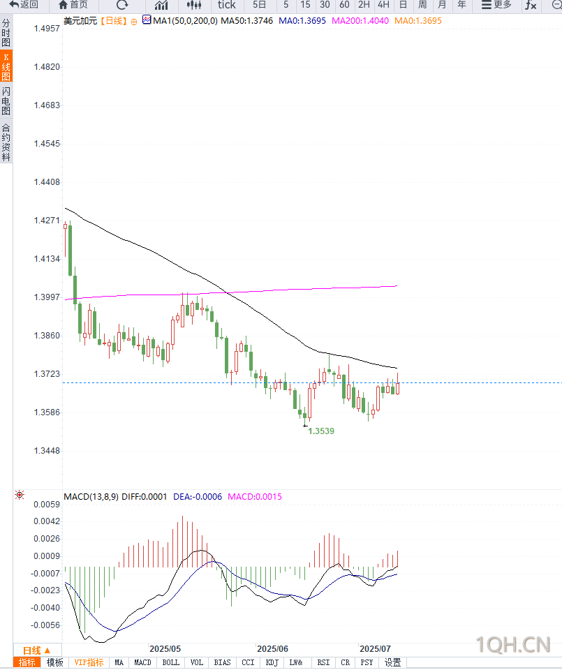 从技术图形来看,美元兑加元在1.3640区域获得支撑后反弹,目前上行目标关注1.3735阻力位,突破后将有望挑战6月高点1.3770一带。若再次回落,下方支撑见于1.3650与1.3600区域。