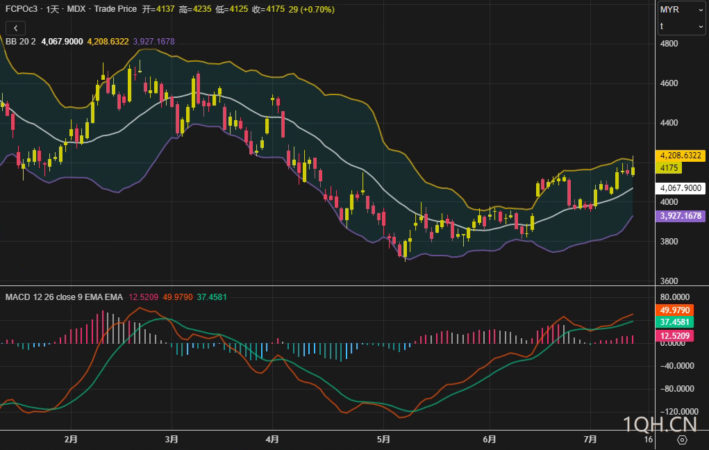 技术层面,知名机构分析师指出,当前价格已突破布林带中轨(4067林吉特),但MACD柱状线收窄至37.5,显示短期动能有所减弱。若跌破4134林吉特支撑,可能下探4072-4096区间。