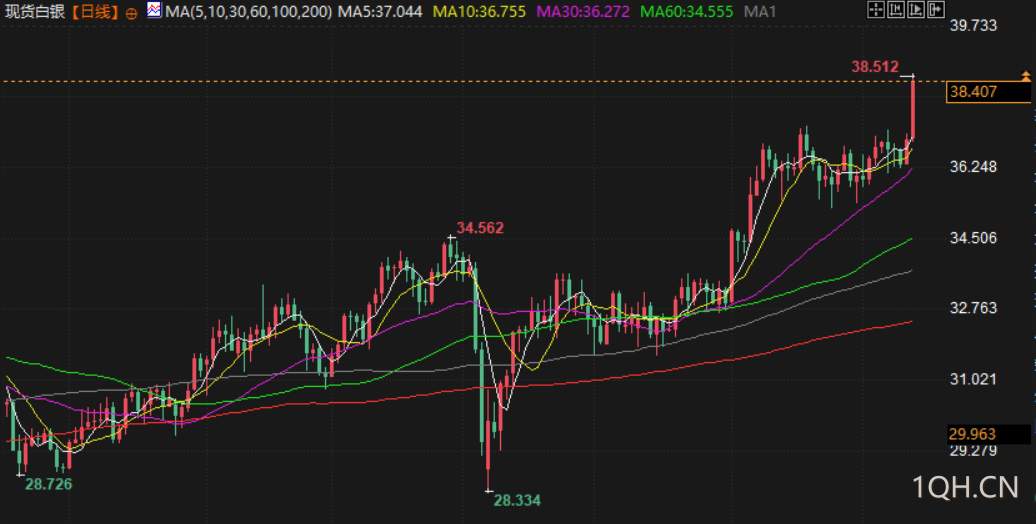 现货白银上涨3.9%,触及每盎司38.46美元的2011年9月以来最高。因美国溢价上升,而伦敦现货市场显示出供应紧张的迹象,周五,伦敦现货白银一个月隐含年化租赁利率跃升至约4.5%,远高于通常接近零的水平,该指标上升是市场紧张的信号。