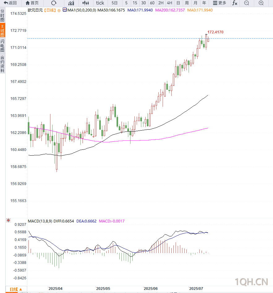欧元/日元在日线图中依旧运行于布林带上轨附近,上行阻力首先位于172.95-173.00区域,该位置不仅是布林带上沿,也是重要的心理关口。若突破该区域,目标将上看7月3日高点174.52,进一步则关注7月11日高点175.43。