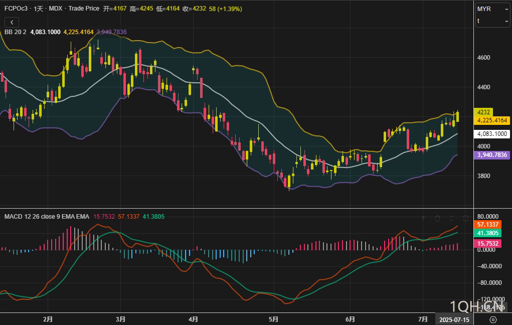 技术面上,4230-4250林吉特区间存在明显抛压,若突破则可能测试年内高点4350林吉特。考虑到MACD柱状线仍处于零轴上方,短期回调或提供结构性做多机会,但需警惕库存数据与汇率波动带来的双向风险。