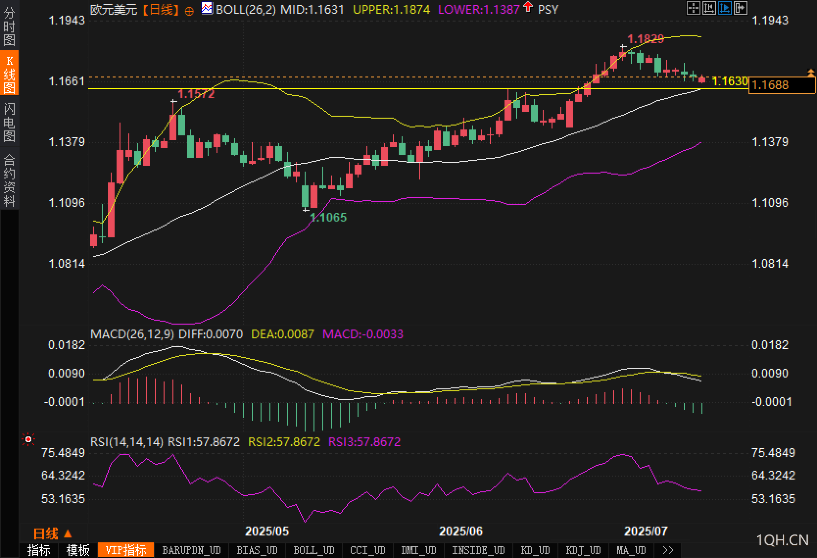 从日线图上看,欧元兑美元自创下阶段高点1.1829后持续回落,目前运行在明显的下降通道中。布林带结构显示,布林中轨位于1.1631,汇价当前正围绕中轨附近运行,短线存在方向选择压力。布林带上下轨(上轨1.1874,下轨1.1387)出现明显收口,显示当前波动率收窄,行情正处于整理蓄势阶段。