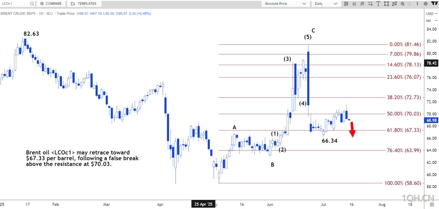 路透技术分析师指出,布伦特原油可能在假突破 70.03 美元的阻力位后回落至每桶 67.33 美元。