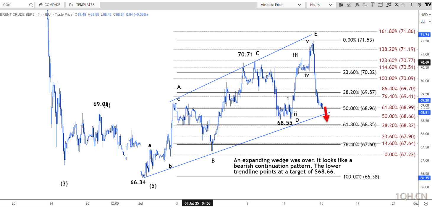 小时图上,一个扩张楔形已经结束。它看起来像是一个看跌的延续形态。下方趋势线指向68.66美元的目标位。