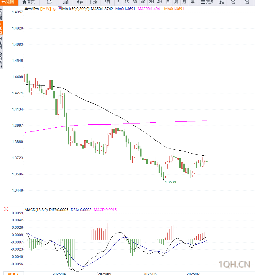 从技术走势来看,USD/CAD过去一周始终运行在1.3638至1.3710区间之间,目前围绕20日指数均线(1.3675附近)震荡整理,暗示短期走势偏中性。