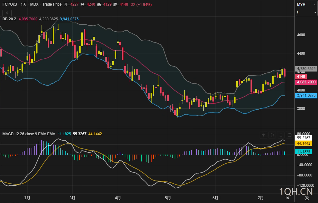 尽管短期承压,部分机构仍对中长期供需格局持谨慎乐观态度。新加坡某大宗商品研究主管指出:"东南亚产区天气扰动持续,7月产量环比增幅或低于季节性均值,叠加印度库存回补需求,价格下行空间有限。"技术分析层面,4000-4100林吉特区间存在密集支撑,若跌破则可能测试布林下轨3941林吉特。