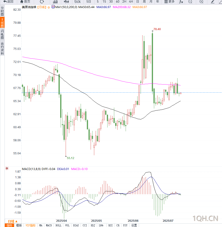 从日线图走势来看,美原油在66美元附近构筑双底结构后反弹,当前价格站稳20日均线,并突破短期下降趋势线,MACD指标显示动能柱由负转正,短线动能增强。