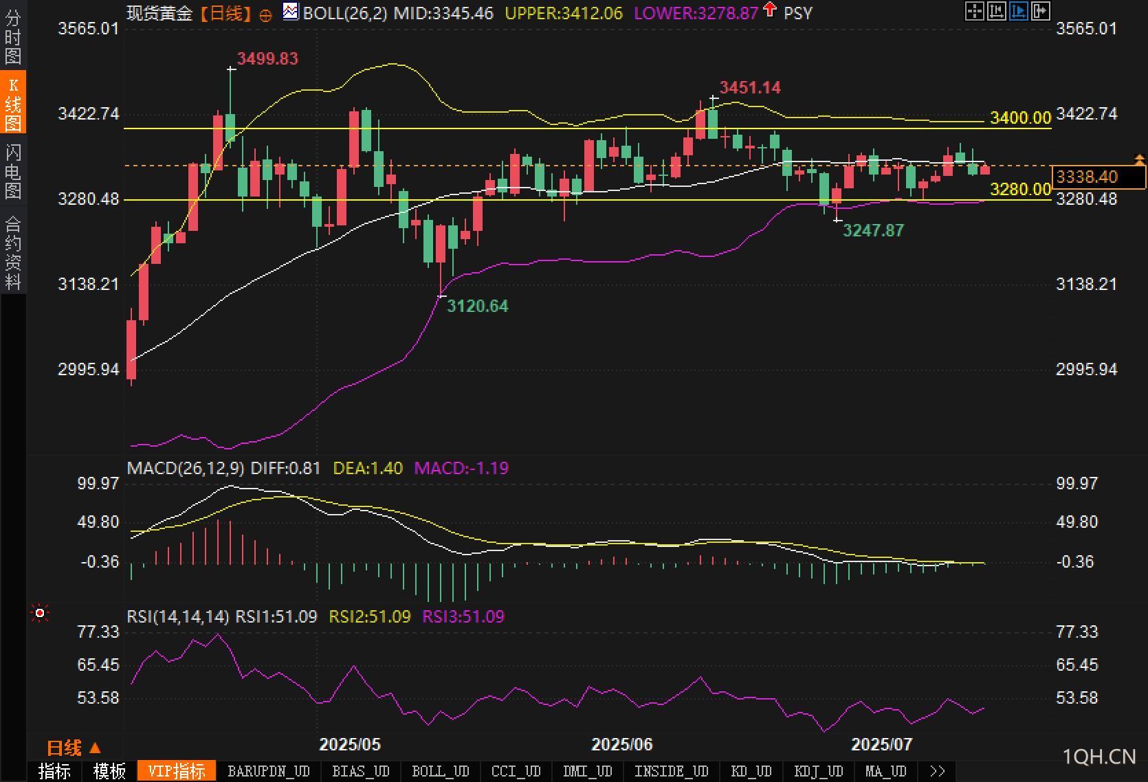 黄金日线图显示,当前价格运行在布林带中轨附近,整体维持在3280—3400美元区间内震荡整理。从K线结构来看,自高点回落以来,3280美元区域形成较强支撑,布林带下轨亦提供动态支撑。